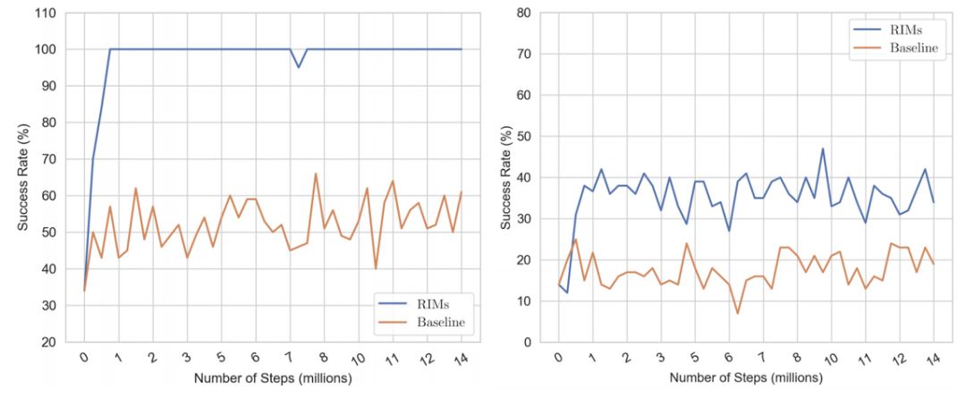 图 5:模型对新干扰项的稳健性。左:在拾取目标物体的任务中,RIM 的性能优于 LSTM。右:当这堆物体中又加入新的干扰项时,二者的性能对比情况:RIM 优于 LSTM。