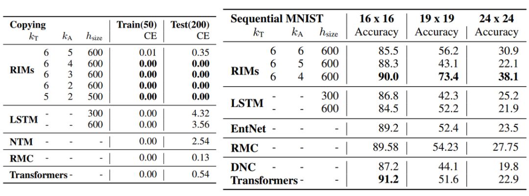 表 1:在复制任务上的性能(左),在 sequential MNIST resolution 任务上的性能(右)。