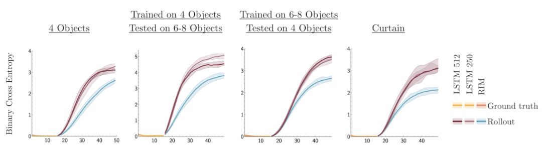 图 4:处理新型 Out-of-Distribution 变化。这里,研究者探讨了 RIM 和 LSTM 基线模型的性能对比情况。输入前 15 个真值帧,系统预测接下来 10 个时间步。在 rollout 阶段,RIM 能够更准确地预测球的动态变化,图中蓝色线表示 RIM 的交叉熵,紫色线表示 LSTM 的交叉熵。注意,当测试集对象与训练集不同时,RIM 的 Out-of-Distribution 泛化效果显著优于 LSTM。