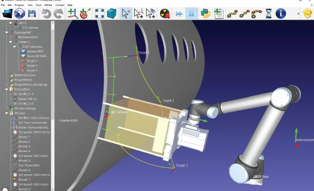 图4 :NASA 正在开发新型的检测系统,离线编程软件为其仿真机器人路径规划。该系统使用配备了红外摄像机的协作机器人, 来测试复合飞机结构中的缺陷。图片来源:RoboDK 公司