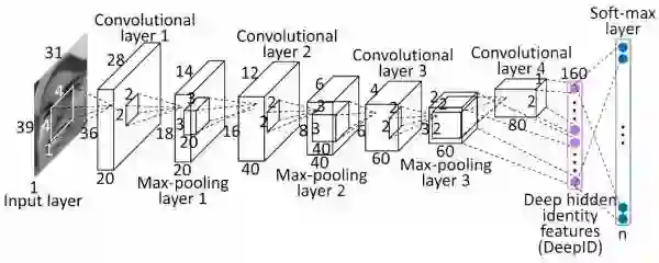 DeepID网络结构是香港中文大学的Sun Yi开发出来用来学习人脸特征的卷积神经网络。每张输入的人脸被表示为160维的向量,学习到的向量经过其他模型进行分类,在人脸验证试验上得到了97.45%的正确率,更进一步的,原作者改进了CNN,又得到了99.15%的正确率。