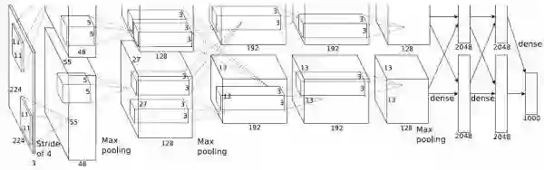 下图即为Alex的CNN结构图。需要注意的是,该模型采用了2-GPU并行结构,即第1、2、4、5卷积层都是将模型参数分为2部分进行训练的。在这里,更进一步,并行结构分为