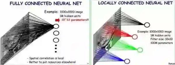 卷积神经网络有两种神器可以降低参数数目,第一种神器叫做局部感知野。一般认为人对外界的认知是从局部到全局的,而图像的空间联系也是局部的像素联系较为紧密,而距离较远的像素相关性则较弱。因而,每个神经元其实没有必要对全局图像进行感知,只需要对局部进行感知,然后在更高层将局部的信息综合起来就得到了全局的信息。网络部分构连通的思想,也是受启发于生物学里面的视觉系统结。视觉皮层的神经元就是局部接受信息的(即这些神经元只响应某些特定区域的刺激)。如下图所示:左图为全连接,右图为局部连接。