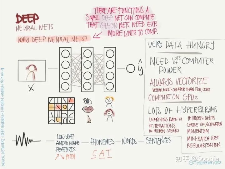 左下: CNN 的深度网络可以将底层的简单特征逐层组合成越来越复杂的特征,深度越大,其能分类的图像的复杂度和多样性就越大。RNN 的深度网络也是同样的道理,可以将语音分解为音素,再逐渐组合成字母、单词、句子,执行复杂的语音到文本任务。