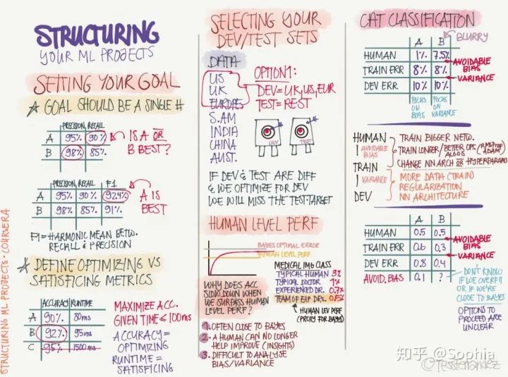 我们需要按过程或结构来设定我们的机器学习系统,首先需要设定模型要达到的目标,例如它的预期性能是多少、度量方法是什么等。然后分割训练、开发和测试集,并预期可能到达的优化水平。随后再构建模型并训练,在开发集和测试集完成验证后就可以用于推断了。