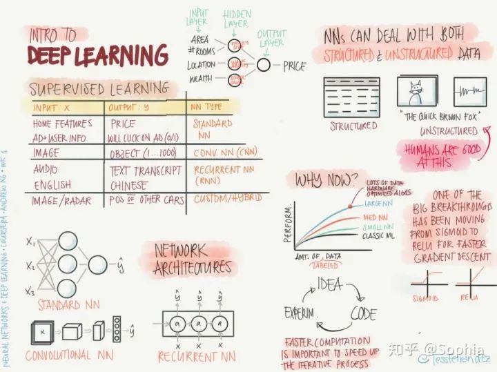 右下: 深度学习能发展起来主要是由于大数据的出现,神经网络的训练需要大量的数据;而大数据本身也反过来促进了更大型网络的出现。深度学习研究的一大突破是新型激活函数的出现,用 ReLU 函数替换sigmoid 函数可以在反向传播中保持快速的梯度下降过程,sigmoid 函数在正无穷处和负无穷处会出现趋于零的导数,这正是梯度消失导致训练缓慢甚至失败的主要原因。要研究深度学习,需要学会「idea—代码—实验—idea」的良性循环。