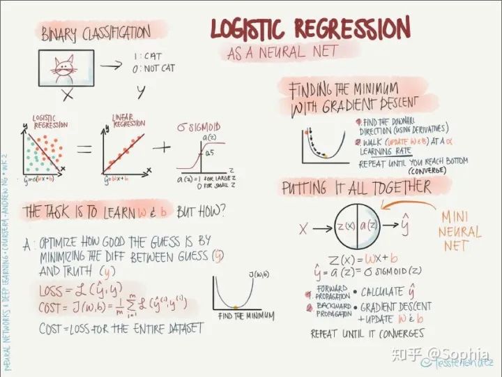 左上: logistic 回归主要用于二分类问题,如图中所示,logistic 回归可以求解一张图像是不是猫的问题,其中图像是输入(x),猫(1)或非猫(0)是输出。我们可以将 logistic 回归看成将两组数据点分离的问题,如果仅有线性回归(激活函数为线性),则对于非线性边界的数据点(例如,一组数据点被另一组包围)是无法有效分离的,因此在这里需要用非线性激活函数替换线性激活函数。在这个案例中,我们使用的是 sigmoid 激活函数,它是值域为(0, 1)的平滑函数,可以使神经网络的输出得到连续、归一(概率值)的结果,例如当输出节点为(0.2, 0.8)时,判定该图像是非猫(0)。