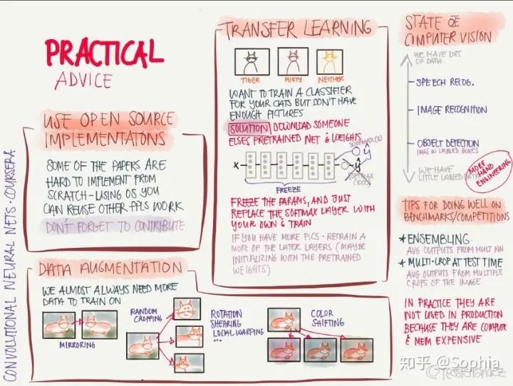 以上是所有关于吴恩达深度学习专项课程的信息图,由于它们包含的信息较多,我们只介绍了一部分,还有很多内容只是简单的一笔带过。所以各位读者最好可以下载该信息图,并在后面的学习过程中慢慢理解与优化。