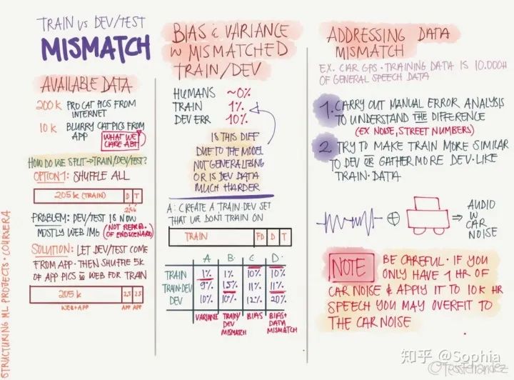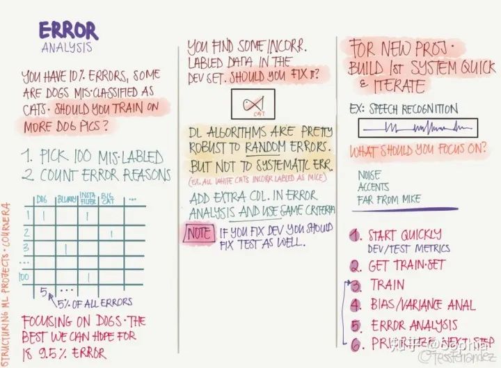 上图展示了三个分割数据集及其表现所需要注意的地方,也就是说如果它们间有不同的正确率,那么我们该如何修正这些「差别」。例如训练集的正确率明显高于验证集与测试集表明模型过拟合,三个数据集的正确率都明显低于可接受水平可能是因为欠拟合。