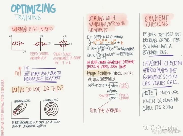 以上展示了最优化常常出现的问题和所需要的操作。首先在执行最优化前,我们需要归一化输入数据,而且开发集与测试集归一化的常数(均值与方差)与训练集是相同的。上图也展示了归一化的原因,因为如果特征之间的量级相差太大,那么损失函数的表面就是一张狭长的椭圆形,而梯度下降或最速下降法会因为「锯齿」现象而很难收敛,因此归一化为圆形有助于减少下降方向的震荡。