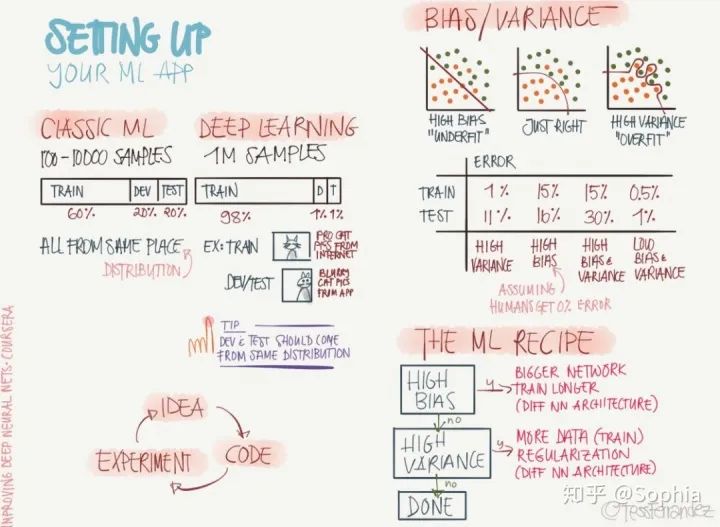那么部署你的机器学习模型需要注意些什么?下图展示了构建 ML 应用所需要的数据集分割、偏差与方差等问题。