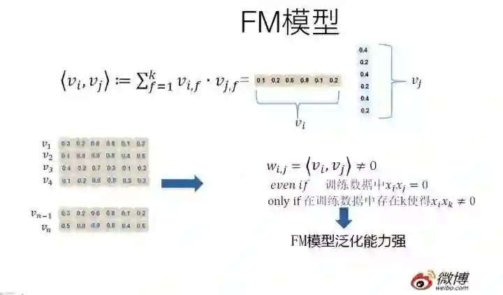 那么为什么说FM的这种特征embedding模式,在大规模稀疏特征应用环境下比较好用?为什么说它的泛化能力强呢?参考上图说明。即使在训练数据里两个特征并未同时在训练实例里见到过,意味着xi and xj 一起出现的次数为0,如果换做SVM的模式,是无法学会这个特征组合的权重的。但是因为FM是学习单个特征的embedding,并不依赖某个特定的特征组合是否出现过,所以只要特征 xi 和其它任意特征组合出现过,那么就可以学习自己对应的embedding向量。于是,尽管 xi and xj 这个特征组合没有看到过,但是在预测的时候,如果看到这个新的特征组合,因为 xi 和 xj 都能学会自己对应的embedding,所以可以通过内积算出这个新特征组合的权重。这是为何说FM模型泛化能力强的根本原因。