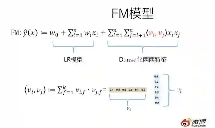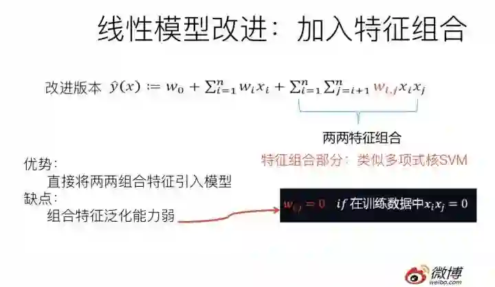 其实想达到这一点并不难,如上图在计算公式里加入二阶特征组合即可,任意两个特征进行组合,可以将这个组合出的特征看作一个新特征,融入线性模型中。而组合特征的权重可以用来表示,和一阶特征权重一样,这个组合特征权重在训练阶段学习获得。其实这种二阶特征组合的使用方式,和多项式核SVM是等价的。虽然这个模型看上去貌似解决了二阶特征组合问题了,但是它有个潜在的问题:它对组合特征建模,泛化能力比较弱,尤其是在大规模稀疏特征存在的场景下,这个毛病尤其突出,比如CTR预估和推荐排序,这些场景的最大特点就是特征的大规模稀疏。所以上述模型并未在工业界广泛采用。那么,有什么办法能够解决这个问题吗?