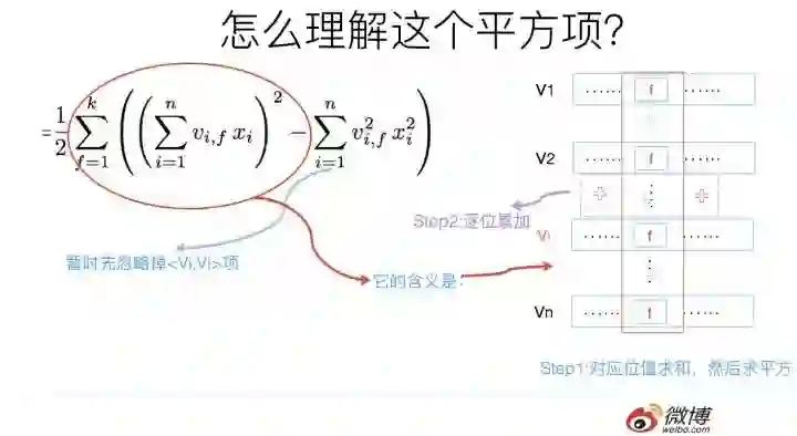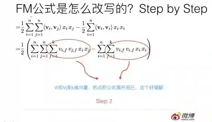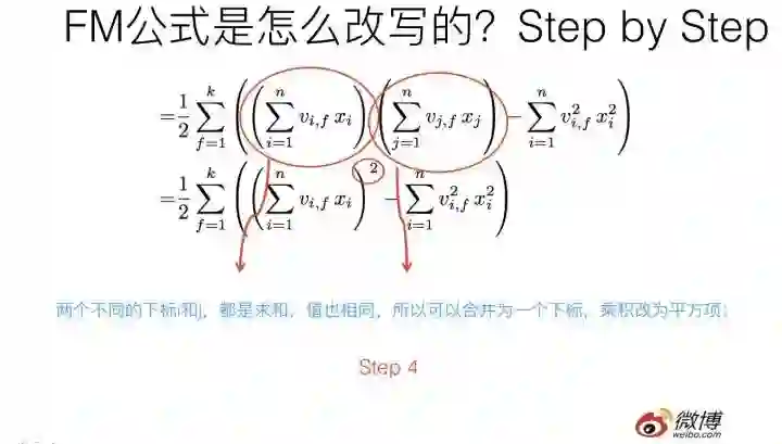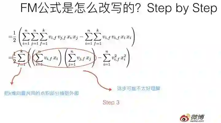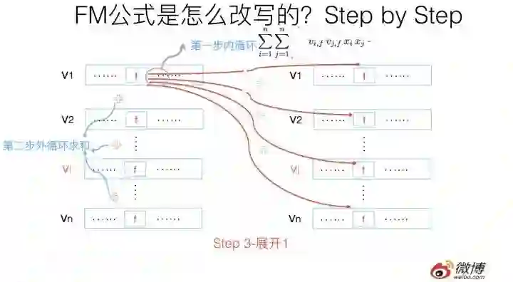 其实吧,如果把k维特征向量内积求和公式抽到最外边后,公式就转成了上图这个公式了(不考虑最外边k维求和过程的情况下)。它有两层循环,内循环其实就是指定某个特征的第f位(这个f是由最外层那个k指定的)后,和其它任意特征对应向量的第f位值相乘求和;而外循环则是遍历每个的第f位做循环求和。这样就完成了指定某个特征位f后的特征组合计算过程。最外层的k维循环则依此轮循第f位,于是就算完了步骤三的特征组合。