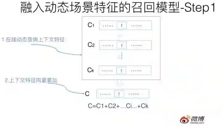 首先,由于上下文特征的动态性,所以给定用户UID后,可以在线查询某个上下文特征对应的embedding向量,然后所有上下文向量求和得到综合的上下文向量C。这个过程其实和U及I的累加过程是一样的,区别无非是上下文特征需要在线实时计算。而一般而言,场景上下文特征数都不多,所以在线计算,速度方面应可接受。