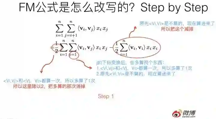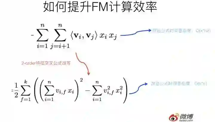 从FM的原始数学公式看,因为在进行二阶(2-order)特征组合的时候,假设有n个不同的特征,那么二阶特征组合意味着任意两个特征都要进行交叉组合,所以可以直接推论得出:FM的时间复杂度是n的平方。但是如果故事仅仅讲到这里,FM模型是不太可能如此广泛地被工业界使用的。因为现实生活应用中的n往往是个非常巨大的特征数,如果FM是n平方的时间复杂度,那估计基本就没人带它玩了。