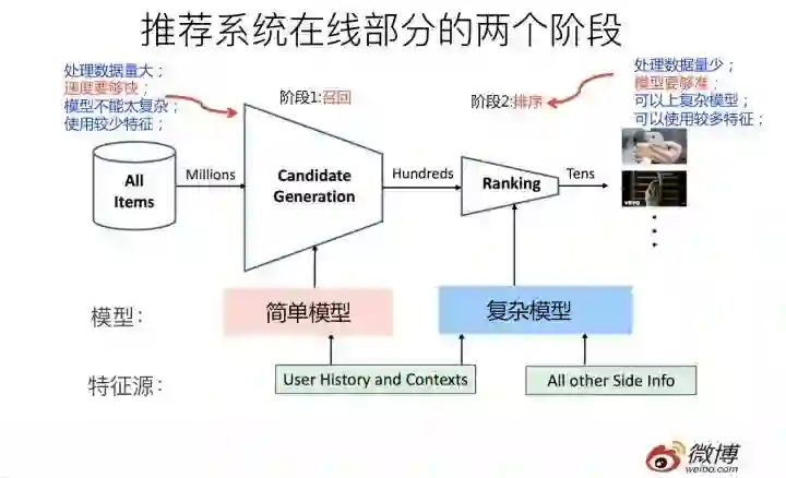因为粗排是可选的,对于大多数推荐系统来说,通常在线部分的主体分为两个阶段就够,第一个阶段是召回,第二个阶段是排序。因为个性化推荐需要给每个用户展现不同的信息流或者物品流,而对于每个用户来说,可供推荐的物品,在具备一定规模的公司里,是百万到千万级别,甚至上亿。所以对于每一个用户,如果对于千万级别物品都使用先进的模型挨个进行排序打分,明显速度上是算不过来的,资源投入考虑这么做也不划算。从这里可以看出,召回阶段的主要职责是:从千万量级的候选物品里,采取简单模型将推荐物品候选集合快速筛减到千级别甚至百级别,这样将候选集合数量降下来,之后在排序阶段就可以上一些复杂模型,细致地对候选集进行个性化排序。