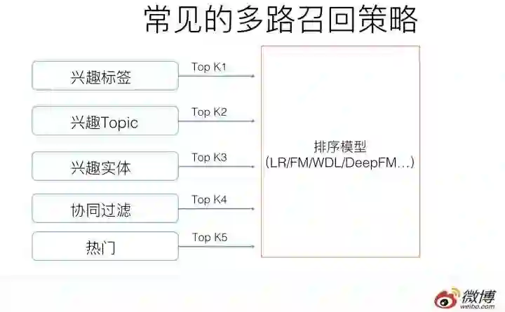 目前工业界的推荐系统,在召回阶段,一般都采取多路召回策略。上图展示了一个简化版本的例子,以微博信息流排序为例,不同业务召回路数不太一样,但是常用的召回策略,基本都会包含,比如兴趣标签,兴趣Topic,兴趣实体,协同过滤,热门,相同地域等,多者几十路召回,少者也有7/8路召回。