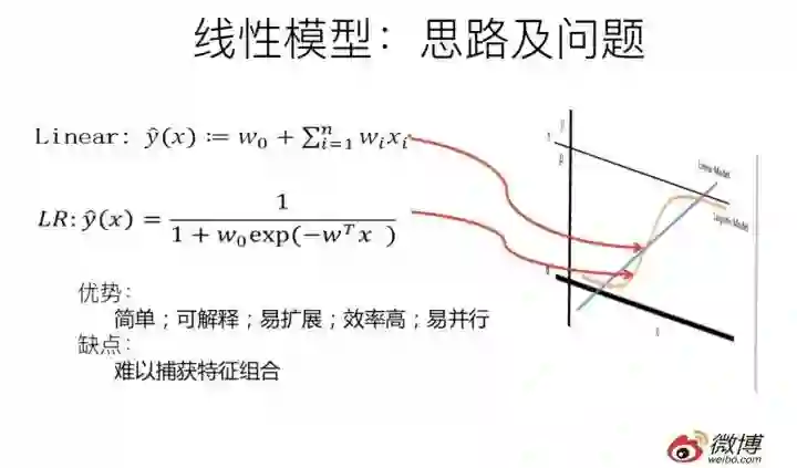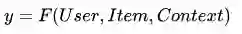 意思是,我们利用用户(User)相关的特征,物品(Item)相关的特征,以及上下文特征(Context,比如何时何地用的什么牌子手机登陆等等)学习一个映射函数F。学好这个函数后,当以后新碰到一个Item,我们把用户特征,物品特征以及用户碰到这个物品时的上下文特征输入F函数,F函数会告诉我们用户是否对这个物品感兴趣。如果他感兴趣,就可以把这个Item作为推荐结果推送给用户。