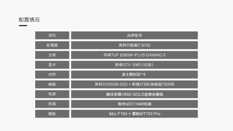 这台兼容机全套装配下来大概花费 6000 元左右,之所以选择台式电脑还是考虑到性价比,并且目前已经不在单位宿舍居住了,有自己的住所放置台式电脑也能方便一些。