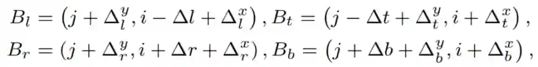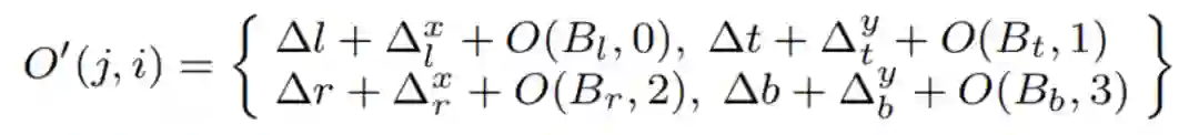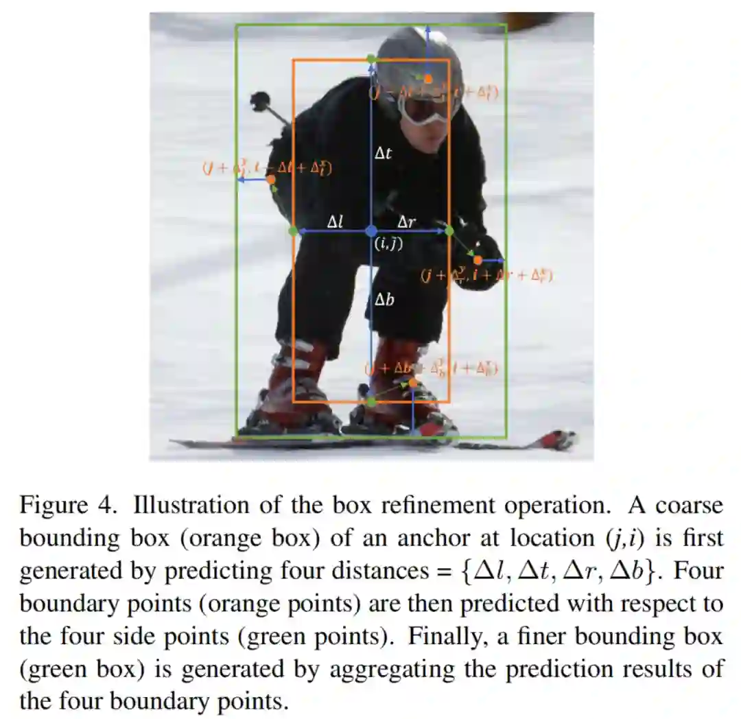 由于pos和neg加权函数都以IoU作为输入,更准确的IoU可以促使更高质量的样本,有利于学习更强的特征。作者提出一个Box Refinement操作,基于预测偏移图 ,其中 分别表示从当前Anchor中心到最左边的l、最上面的r、最右边的r和最下面的b边的预测距离,如图4所示。由于靠近物体边界的点更有可能预测准确的位置,所以作者设计了一个可学习的预测模块基于粗边界框为每边生成一个边界点。