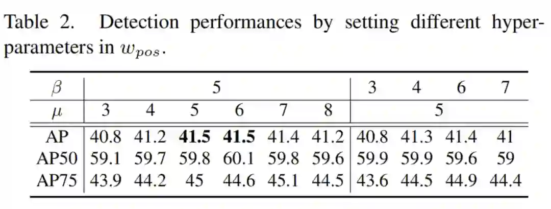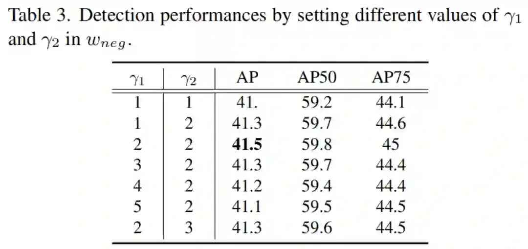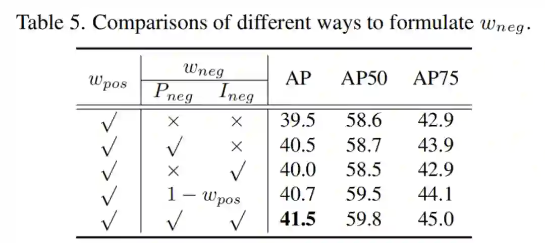 作者还进行了几个实验来研究DW对超参数 和 的鲁棒性,这些参数用于调节负样本权重的相对尺度。使用不同的 和 组合得到的AP结果范围为41~41.5,如表所示。这意味着DW的性能对这2个超参数不敏感。因此,在所有的实验中都采用了 , 。