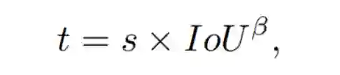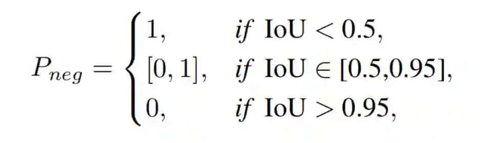 根据COCO的评价指标,小于θ的IoU是一个错误预测的充分条件。这意味着一个不满足IoU度量的预测边界框将被视为一个负样本检测,即使它有一个很高的cls分数。也就是说,IoU是确定成为一个负样本的概率的唯一因素,用 表示。由于COCO采用了0.5~0.95的IoU区间来估计AP,因此边界框的概率 应满足以下规则: