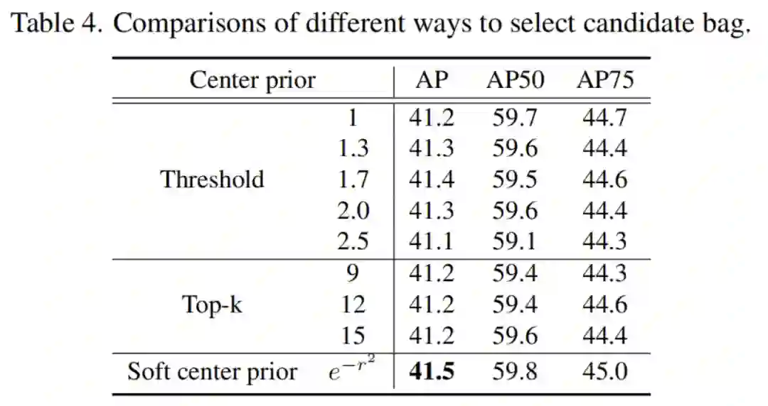 结果如表4所示。可以看出,AP性能在41.1~41.5之间略有波动,这表明我们的DW对候选袋的分离方法具有鲁棒性。