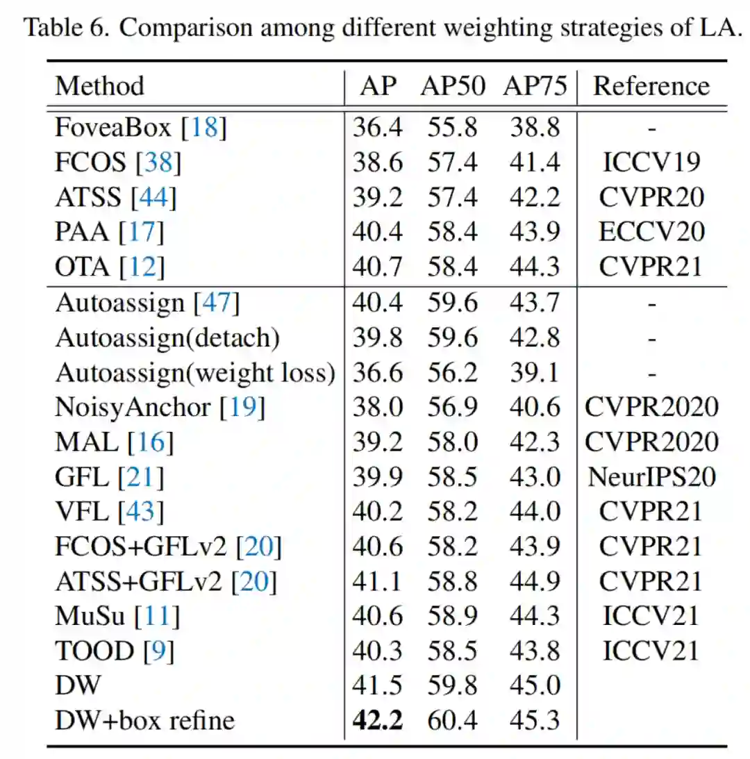 通过对MSCOCO的综合实验,证明了提出的DW方法的优势。特别是,它在单尺度训练方案下,将基于ResNet-50的FCOS检测器在COCO验证集上的结果提升到了42.2AP,超过了其他LA方法。