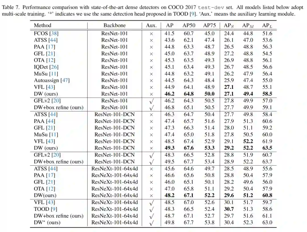 在没有Box Refinement的情况下,DW方法达到41.5AP,这是第1个在不增加FCOS-ResNet-50的情况下,在COCO上实现超过41AP性能的方法。通过Box Refinement,DW可达到42.2AP,如表6所示。表7还显示,Box Refinement可以持续地提高具有不同Backbone的DW的性能。