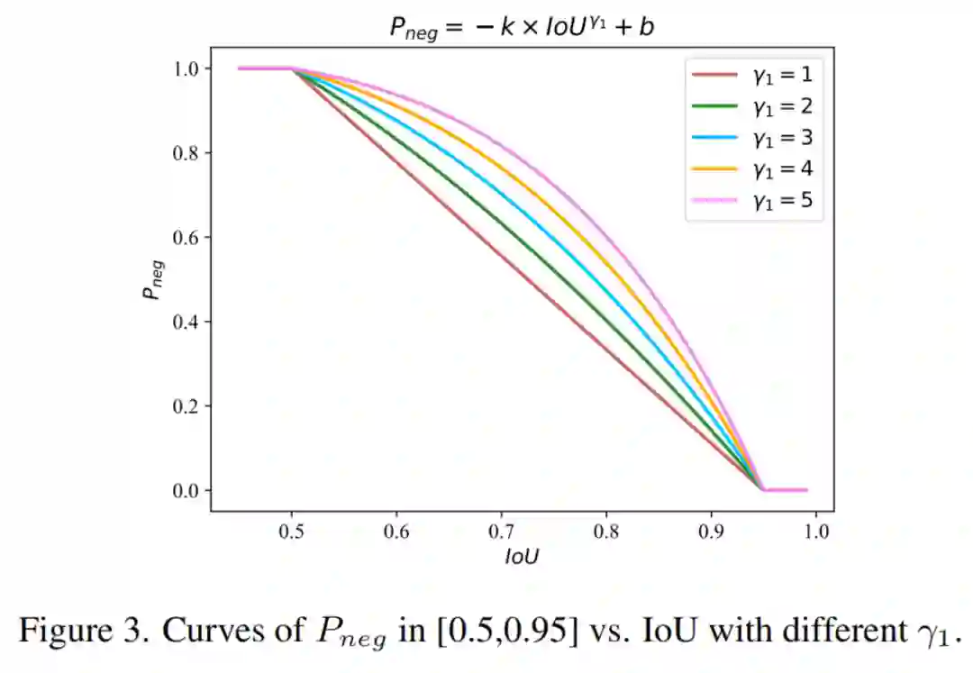 它通过点(0.5,1)和(0.95,0)。一旦确定,参数k和b可以用未确定系数的方法得到。图3绘制了 vs.IoU。具有不同 值的IoU。