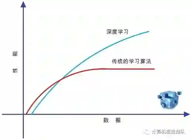 在图2中,既然我们把深度学习和传统的监督学习和无监督学习单列出来,自然是有一定道理的。这就是因为,深度学习是高度数据依赖型的算法,它的性能通常随着数据量的增加而不断增强,也就是说它的可扩展性(Scalability)显著优于传统的机器学习算法(如图3所示)。