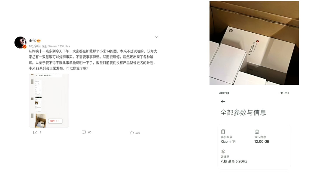 就在小米新一代旗舰发布越来越近之时,网上曝光了疑似小米 14 新品的包装盒,预示着小米可能跳过小米 13,直接发布小米 14 系列。今日下午,小米公关部总经理@王化 辟谣称,目前没有产品型号更名的计划,小米 13 系列会正常发布。该消息坐实了小米新机会继续采用小米 13 系列的命名。小米此前已经官宣,新旗舰率先搭载第二代骁龙 8 移动平台,如无意外,我们就会见到这些新机。