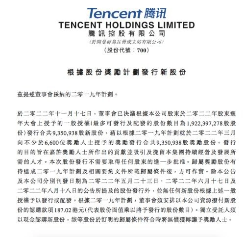 腾讯公告称,董事会已决议根据 2019 年计划于 2022 年 3 月向不少于 6600 位奖励人士授予的奖励发行合共 935.09 万股奖励股份。腾讯控股收盘股价为 292 港元 / 股,自上月最低点大幅度反弹约 48%。若按 6600 人计算,此次股权激励平均每人能获得 41.4 万港元,折合人民币 37.8 万元。