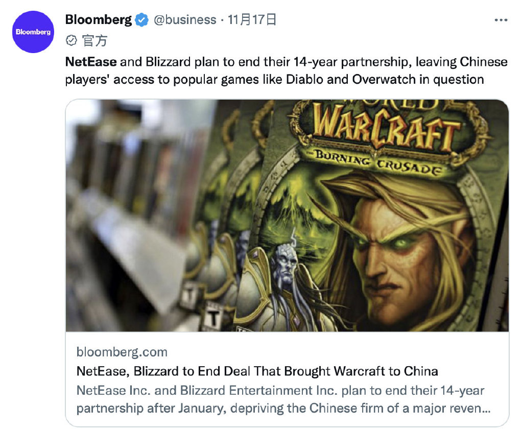据彭博社爆料,网易与暴雪停止的合作的关键问题在于,对于知识产权的所有权以及对中国数百万玩家数据的控制权,由于此次会谈不公开,因此相关人士要求匿名。除此之外,网易在另一份声明中表示,在 2021 年和 2022 年前 9 个月,暴雪游戏的收入在网易总收入中占比较低。彭博社称在今年夏季,暴雪和网易的合作就出现了裂隙,当时他们取消了一款开发了三年的《魔兽世界》手游,而网易解散了一个 100 多名开发人员的团队。