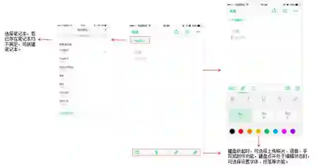通过APP主界面新建笔记,支持上传照片、语音、附件、手写、字体设置、段落设置等功能。