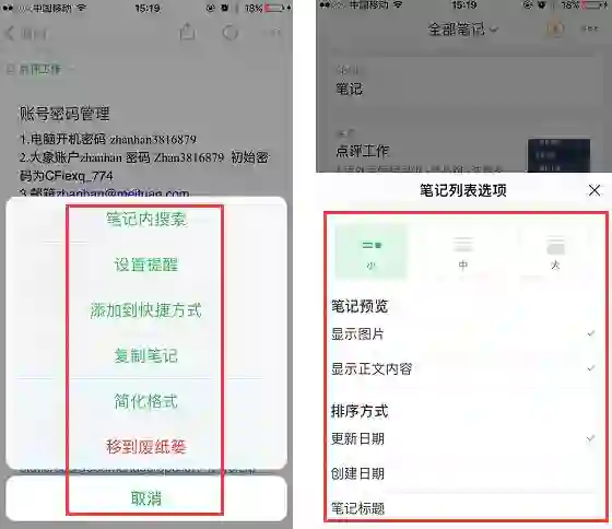 印象笔记支持添加到快捷方式,显示图片和正文内容预览方式,排序方式等功能。