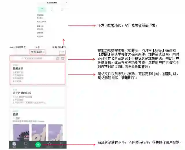二者基本信息架构下方都是五个tab页,不过印象笔记的搜索tab页功能貌似作用不大,可考虑去掉或者换成其他tab。