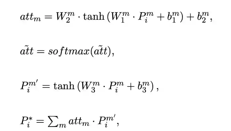 具体而言,我们使用基于注意力机制的多视图融合模块,将来自多个视图的表示融合提炼为单个表示: