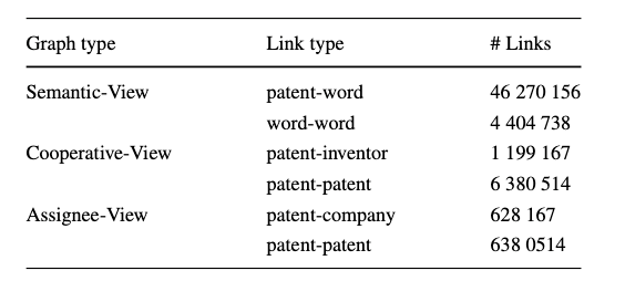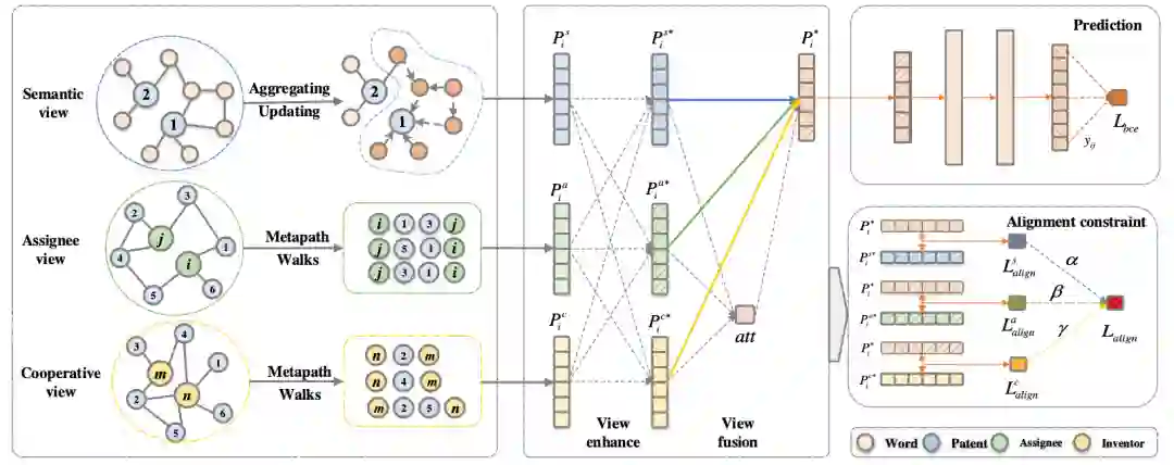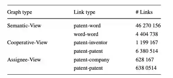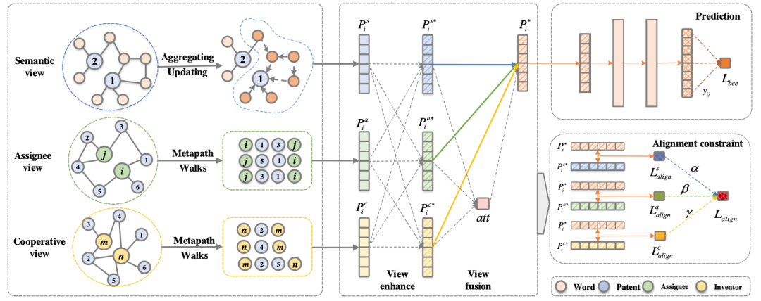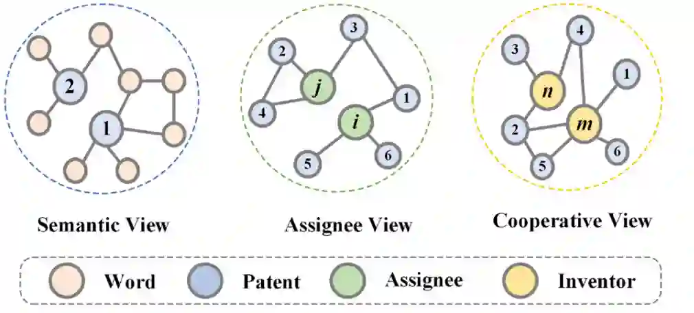 为此,我们基于很少人关注的元数据信息,包括发明人和受让人公司,通过多视图专利网络分析的方法构建了名为 Patent2vec 的新颖框架。具体来说,我们首先根据专利数据的特性,将专利网络划分为三个视图,分别是语义视图、合作视图、受让人视图,如图1所示。进而,我们在单视图网络上根据其网络结构使用了不同的图表示学习方法来获得单视图的专利表示。之后,我们设计了一个包含多视图增强与多视图融合的多视图学习模块,其可以将多种视图的表示融合成单独的专利表示并且可以利用不同视图的相关性来增强专利的表示。最后,我们使用专利的表示来预测专利的类别。