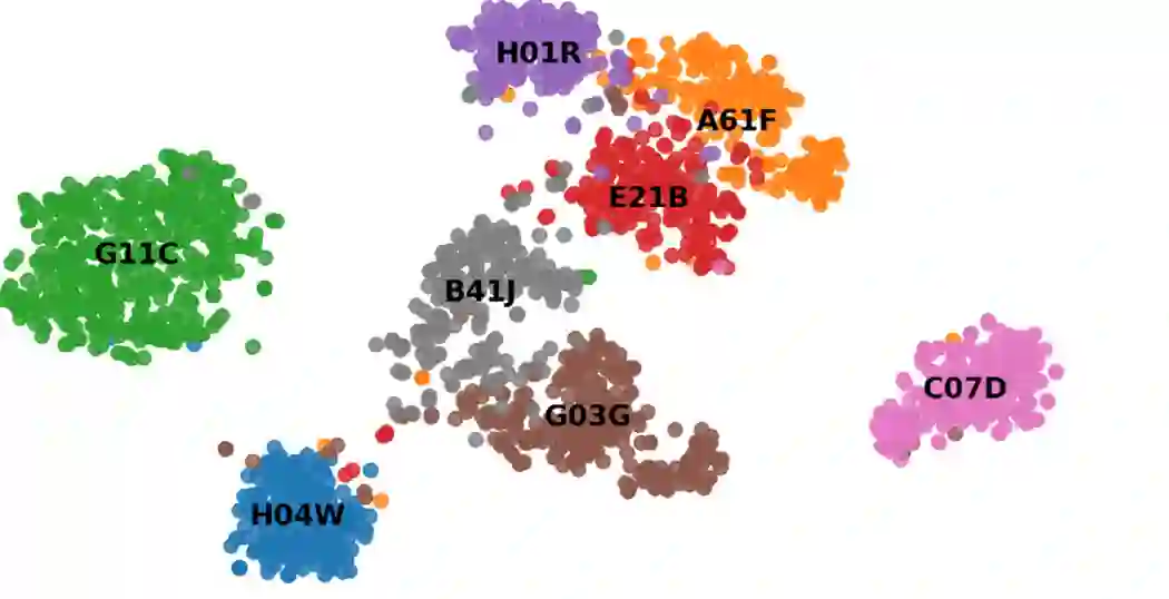 我们选取了若干类别,并使用TSNE将专利的表示可视化,其结果如下图所示,可以看到,我们学习得到的表征是有较好的区分性的。