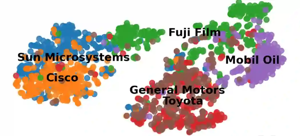 同时,我们选取将不同公司的专利的表示进行了可视化,我们从信息技术和汽车等领域选择了几家公司并对它们进行可视化,我们可以发现具有相似经营业务的公司具有较大的覆盖而不同行业的具有较大的距离。从这两幅可视化的图中可以看出我们提出的多视图表示学习模型是有效的。