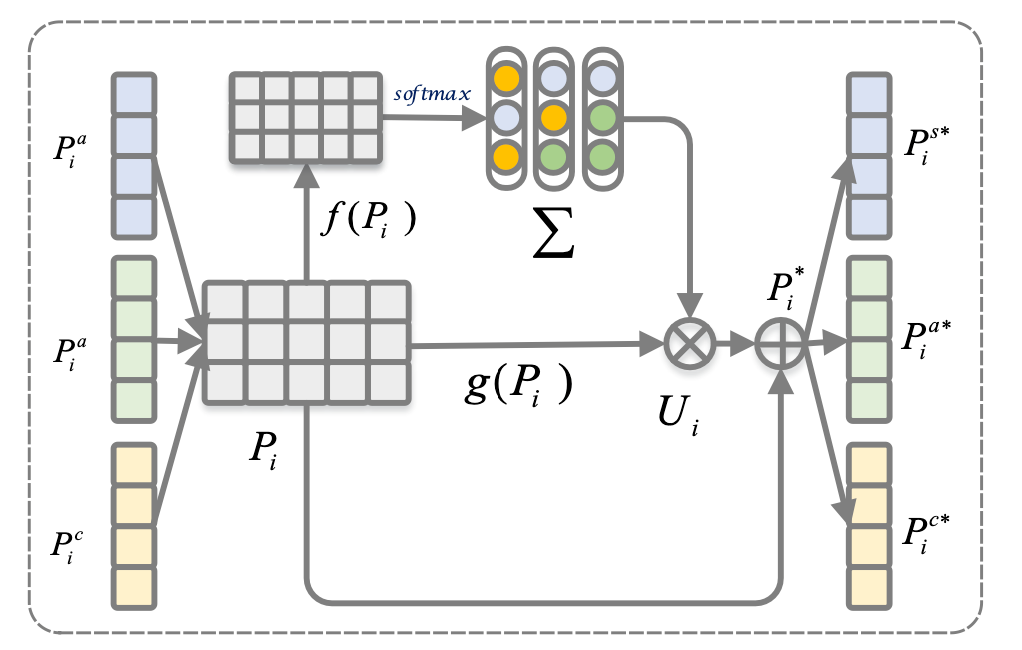 考虑到不同视图之间的相关性的知识,我们设计了一个视图增强模块,它通过从其他视图的表示来增强单视图表示,可以获得更好的单视图表示。其计算流程如上图3所示。