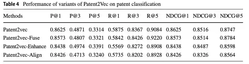 为了进一步验证提出的多视图表示学习模块对于学习专利表示的有效性,我们移除相应的模块,实现了几种变体Paten2vec-Fuse,Patent2vec-Enhance,Patent2vec-Alig等,实验结果如下表所示: