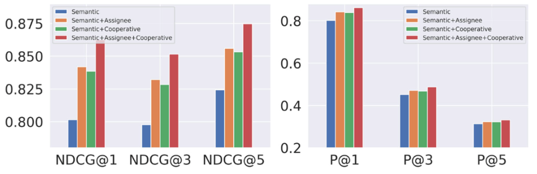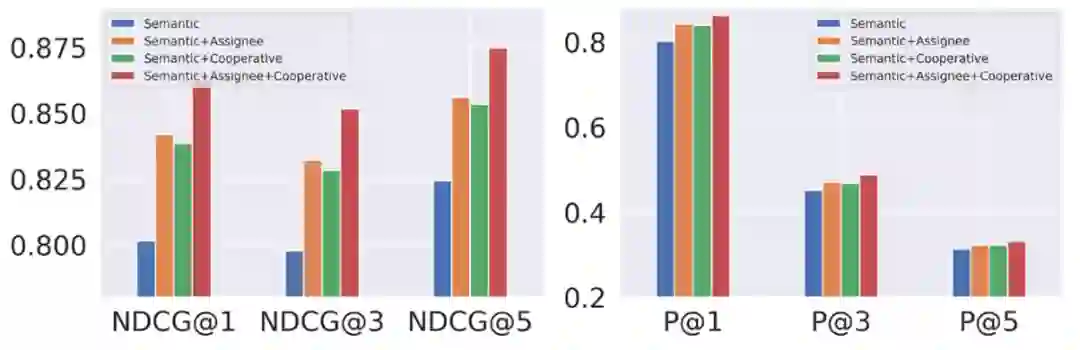 整体而言,实验结果证实了语义信息、受让人和合作信息对于专利分类的价值,并验证了我们所提出的多视图表示学习模块的有效性。