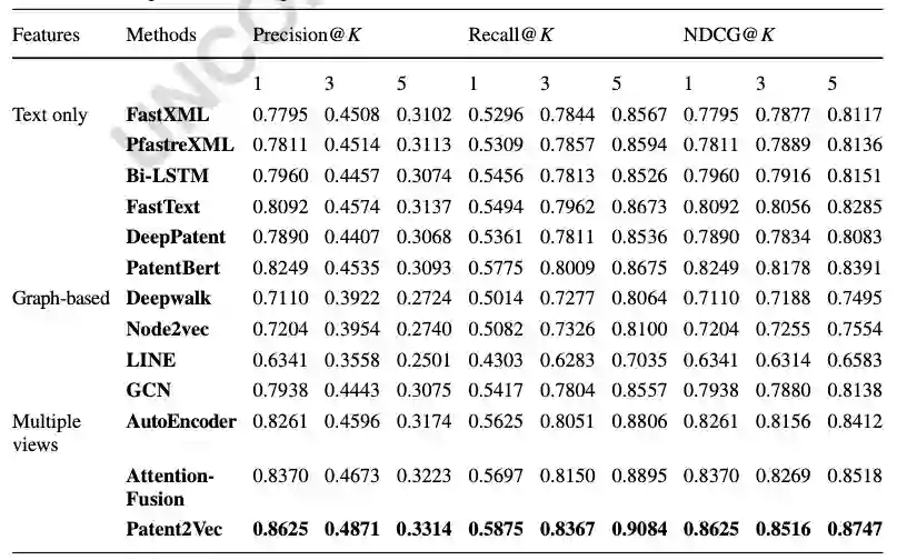 我们根据专利的预测结果正确与否来评估模型性能,采用了Precision@K,Recall@K以及NDCG@K指标进行对比。实验基准模型采用了基于文本分类的FastXML,Bi-LSTM,DeepPatent等模型和基于图的Deepwalk,node2vec,GCN等。整体的实验结果如下表所示: