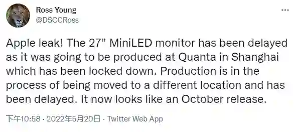 显示器分析师 @DSCCRoss 周五在 Twitter 上透露:传说中采用 mini LED 背光 + ProMotion 可变刷新率技术的 27 英寸“Studio Display Pro”显示器,已被苹果内部给推迟。其援引消息人士的爆料称,苹果原计划在广达电脑(Quanta Computer)的上海工厂生产该设备。但受近年疫情反复的影响,该公司正努力将产线转移到另一个地点。