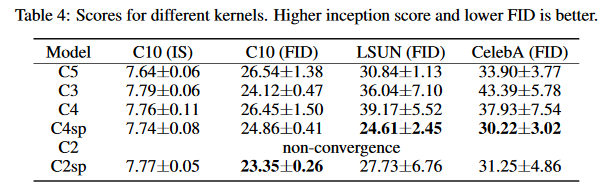 在图像生成任务中,C2sp和C4sp都可以提高图像质量并稳定收敛。具有对称填充的偶数大小的卷积核为强调在线和持续学习的CNN体系结构设计提供了更有效的结构单元。