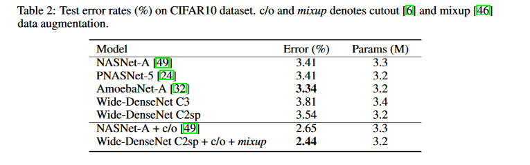 同时论文对比了C2sp和当前的一些NAS网络模型:NASNet,PNASNet和AmoebaNet等。论文应用Wide-DenseNet并调整深度和宽度(K=48,L=50)以具有大约3.3M参数。和SOAT的自动生成模型相比,C2sp的准确率损失了不到0.2%,并且使用cutout和数据增强策略后模型的准确率相比SOAT精度还可以提升0.21%。