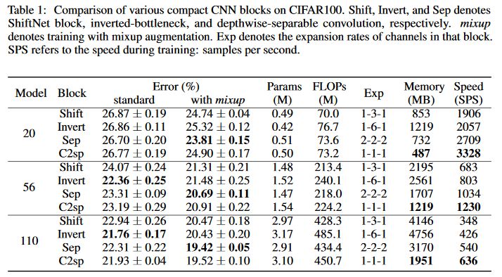 这一节和当前在模型结构方面设计的一些高效CNN模块如Shift Net, 深度可以分离卷积,反瓶颈结构(Mobilenetv2引入)进行对比。主要对比了错误率,参数量,FLOPs,通道扩展速率,内存,速度等指标。具体的测试结果如Table1所示。